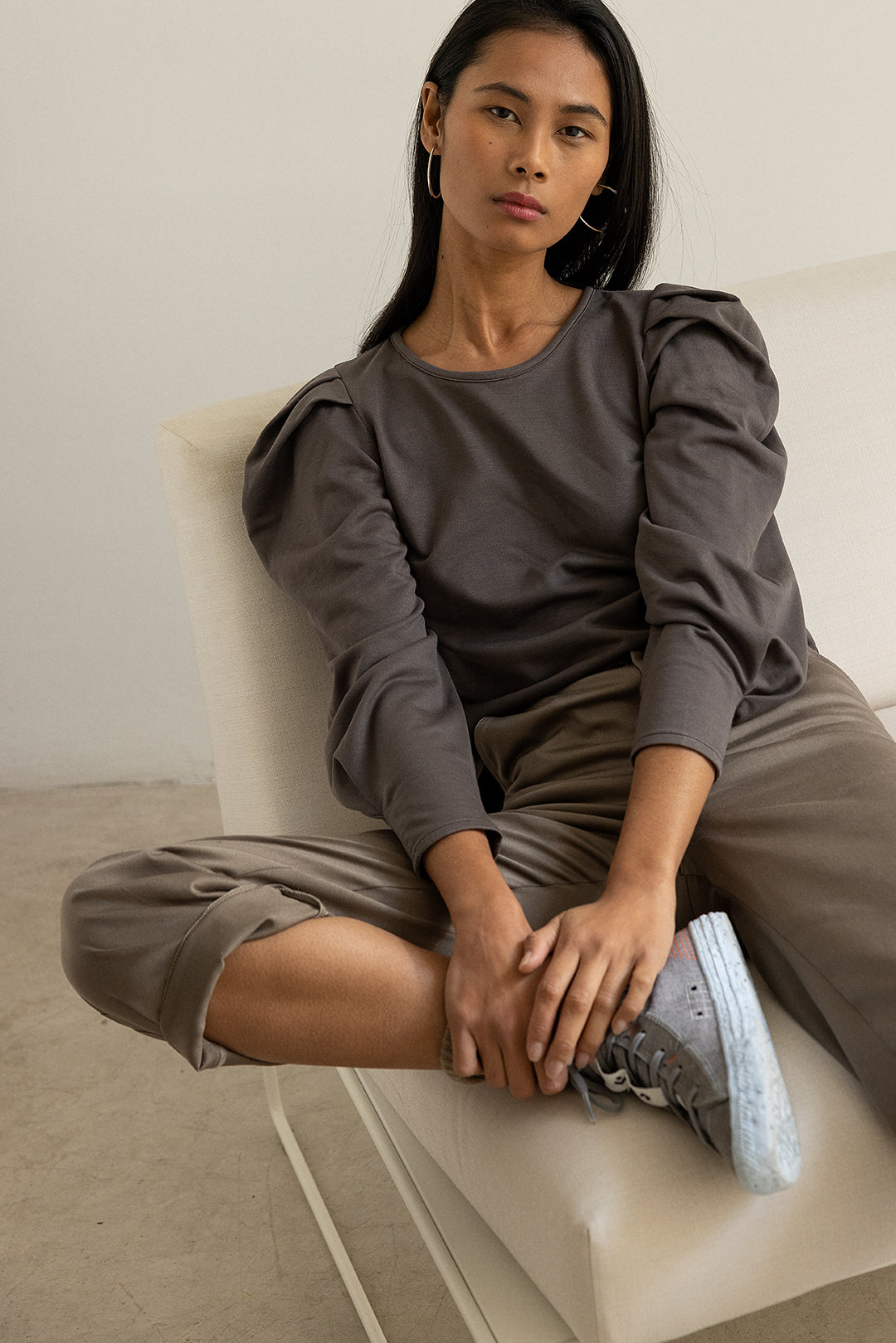 El top Elisa ha sido diseñado pensando en una camiseta básica que puedas combinar con muchas cosas, que favorezca y que tenga algo especial. Las mangas con volumen le dan un toque más femenino y sofisticado. Puede combinarse con el pantalón Erin para conseguir un total look casual chic como una alternativa más elegante al chandal.